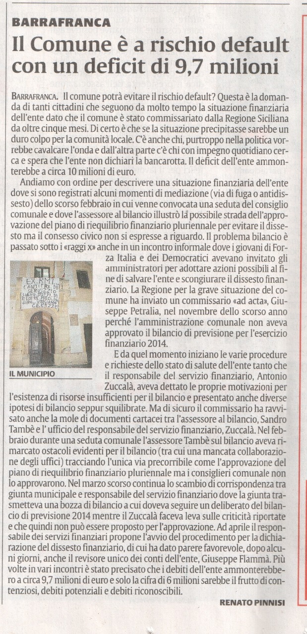 Il comune sarà in grado di evitare il rischio default? Questa è la domanda di tanti cittadini che seguono da molto tempo la situazione finanziaria dell’ente dato che il comune è stato commissariato dalla Regione Siciliana da oltre cinque mesi. Di certo è che se la situazione precipitasse sarebbe un duro colpo per la comunità locale che dovrebbe mettere mano al portafoglio, nonostante le troppe tasse da pagare. C’è anche chi, purtroppo nella politica vorrebbe cavalcare l’onda e dall’altra parte c’è chi con impegno quotidiano cerca e spera che l’ente non dichiari la bancarotta. Il deficit dell’ente ammonterebbe a circa 10 milioni di euro. Andiamo con ordine per descrivere una situazione finanziaria dell’ente dove si sono registrati alcuni momenti di mediazione (per l’ antidissesto) lo scorso febbraio in cui venne convocata una seduta del consiglio comunale e dove l’assessore al bilancio illustrò la possibile strada dell’approvazione del piano di riequilibrio finanziario pluriennale per evitare il dissesto ma il consesso civico non si espresse a riguardo. Il problema bilancio è passato sotto i <> anche in un incontro informale dove i giovani di Forza Italia e dei Democratici avevano invitato gli amministratori per adottare azioni possibili al fine di salvare l’ente e scongiurare il dissesto finanziario. La Regione per la grave situazione del comune ha inviato un commissario <>, Giuseppe Petralia, nel novembre dello scorso anno perché l’amministrazione comunale non aveva approvato il bilancio di previsione per l’esercizio finanziario 2014. E da quel momento iniziano le varie procedure e richieste dello stato di salute dell’ente tanto che il responsabile del servizio finanziario, Antonio Zuccalà, aveva dettato le proprie motivazioni per l’esistenza di risorse insufficienti per il bilancio e presentato anche diverse ipotesi di bilancio seppur squilibrate. Ma di sicuro il commissario ha ravvisato anche la mole di documenti cartacei tra l’assessore al bilancio, Sandro Tambè e l’ ufficio del responsabile del servizio finanziario, Zuccalà. Nel febbraio durante una seduta comunale l’assessore Tambè sul bilancio aveva rimarcato ostacoli evidenti per il bilancio (tra cui una mancata collaborazione degli uffici) tracciando l’unica via precorribile come l’approvazione del piano di riequilibrio finanziario pluriennale ma i consiglieri comunale non lo approvarono. Nel marzo scorso continua lo scambio di corrispondenza tra giunta municipale e responsabile del servizio finanziario dove la giunta trasmetteva una bozza di bilancio a cui doveva seguire un deliberato del bilancio di previsione 2014 mentre il Zuccalà faceva leva sulle criticità riportate e che quindi non può essere proposto per l’approvazione. Ad aprile il responsabile dei servizi finanziari propone l’avvio del procedimento per la dichiarazione del dissesto finanziario, di cui ha dato parere favorevole, dopo alcuni giorni, anche il revisore unico dei conti dell’ente, Giuseppe Flammà. Più volte in vari incontri è stato precisato che i debiti dell’ente ammonterebbero a circa 9,7 milioni di euro e solo la cifra di 6 milioni sarebbe il frutto di contenziosi, debiti potenziali e debiti riconoscibili. I giovani del movimento Forza Italia hanno chiesto la convocazione di una seduta consiliare affinchè l’amministrazione con l’assessore al bilancio parli del problema bilancio.
