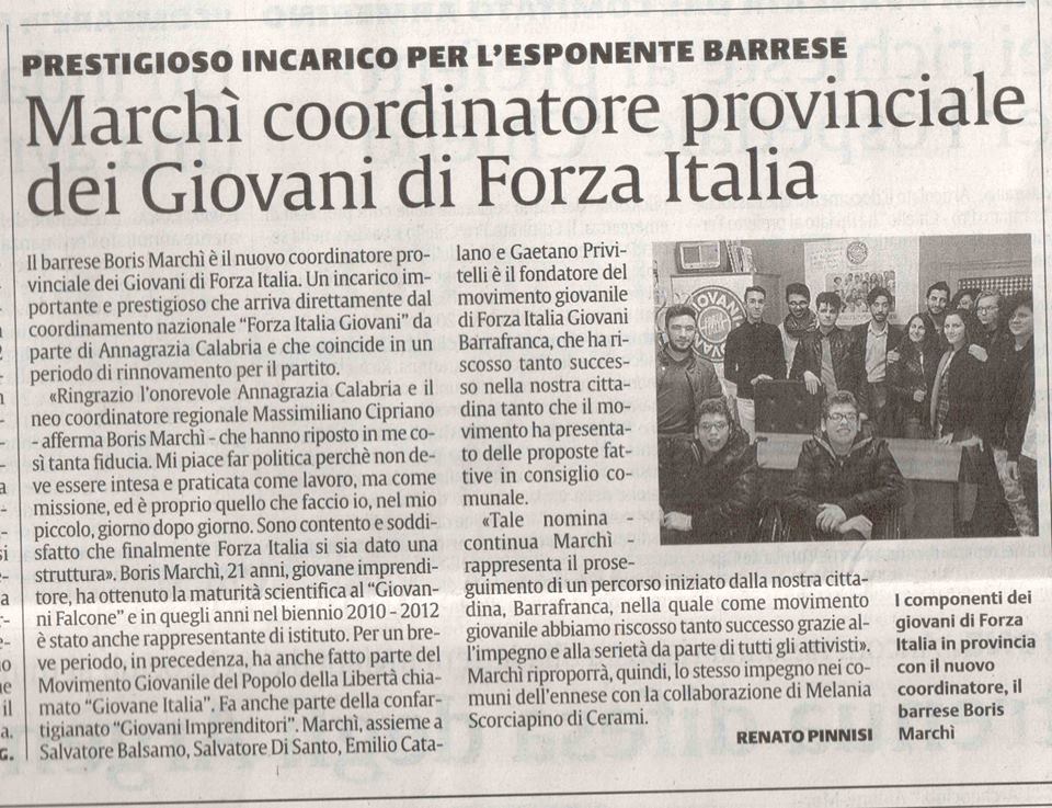 ENNA - La Sicilia, Enna "Marchì Coordinatore Provinciale dei Giovani di Forza Italia. Prestigioso incarico per l'esponente barrese"