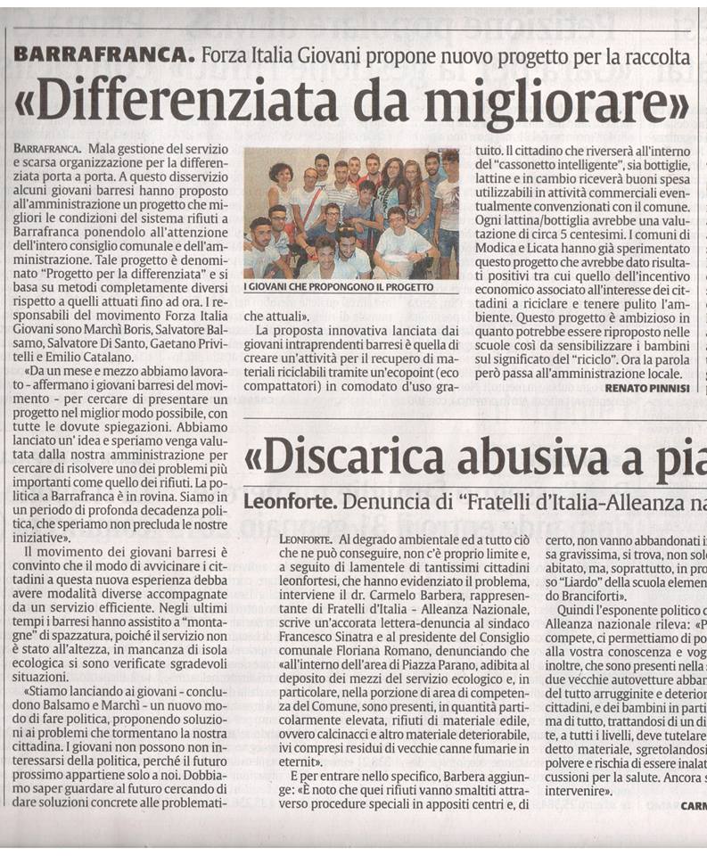 BARRAFRANCA - La Sicilia, Enna 8 Agosto 2014 "Differenziata da migliorare" Forza Italia Giovani propone nuovo progetto per la raccolta. Leggi proposta I Responsabili: Boris Marchì Salvatore Balsamo Emilio Catalano Salvatore Di Santo Gaetano Privitelli